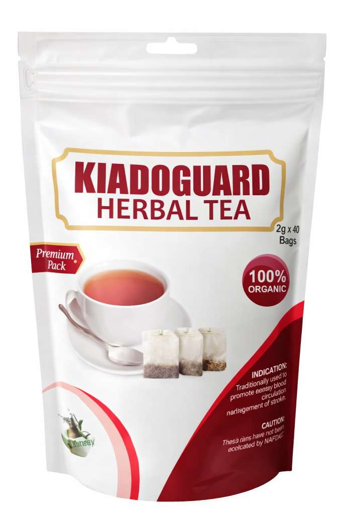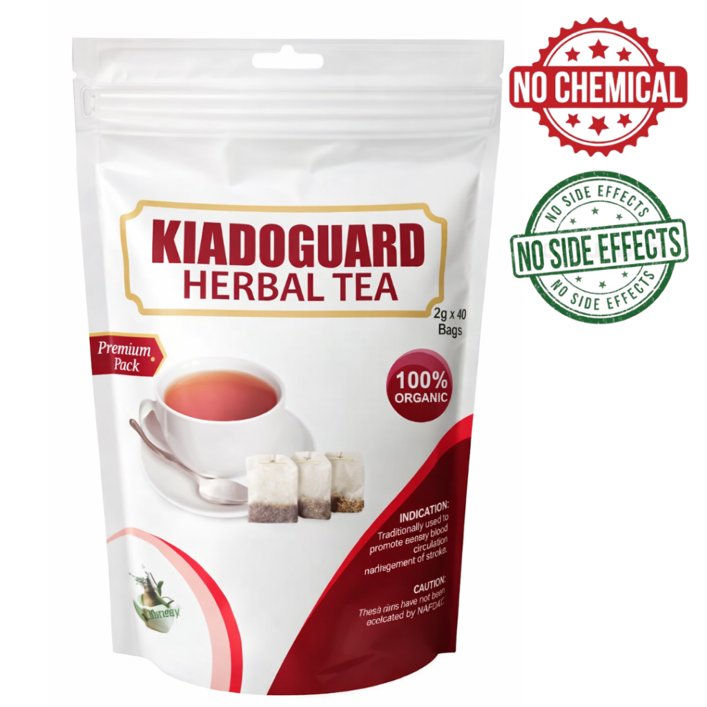 KiadoGuard Herbal Tea is a natural herbal supplement specially formulated to: Support healthy blood circulation, Reduce the risk of stroke, Help manage high blood pressure and Improve overall heart and brain health.